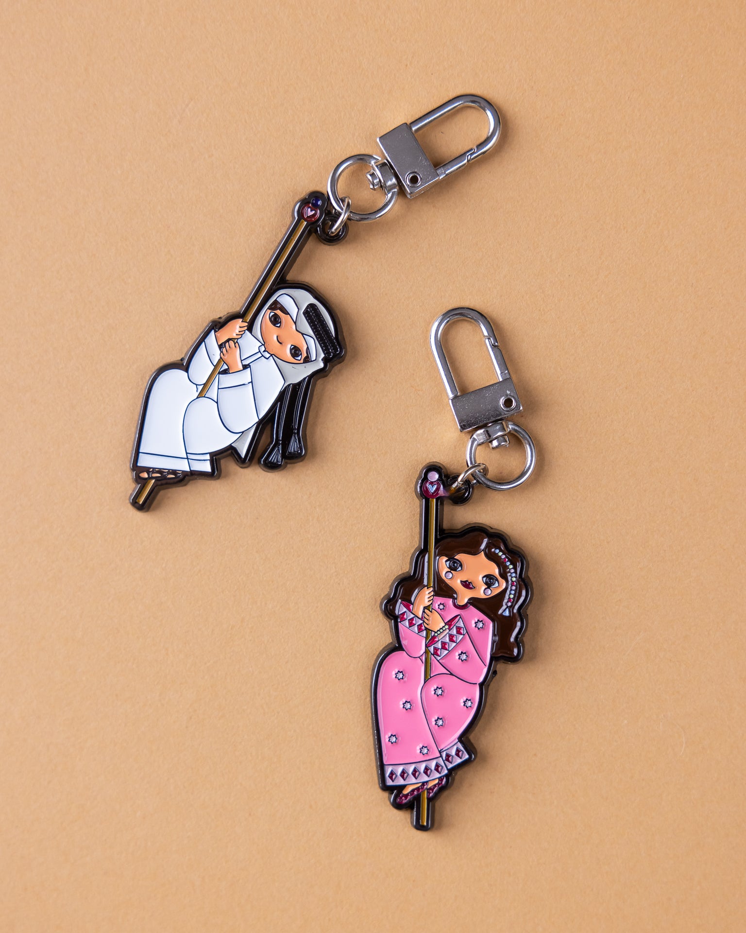 Celebrate Qatari culture with these adorable keychains featuring a charming Qatari boy and girl design. Perfect for accessorizing your hoodie zipper, bag, keys, or any favorite item, these keychains are both stylish and versatile.