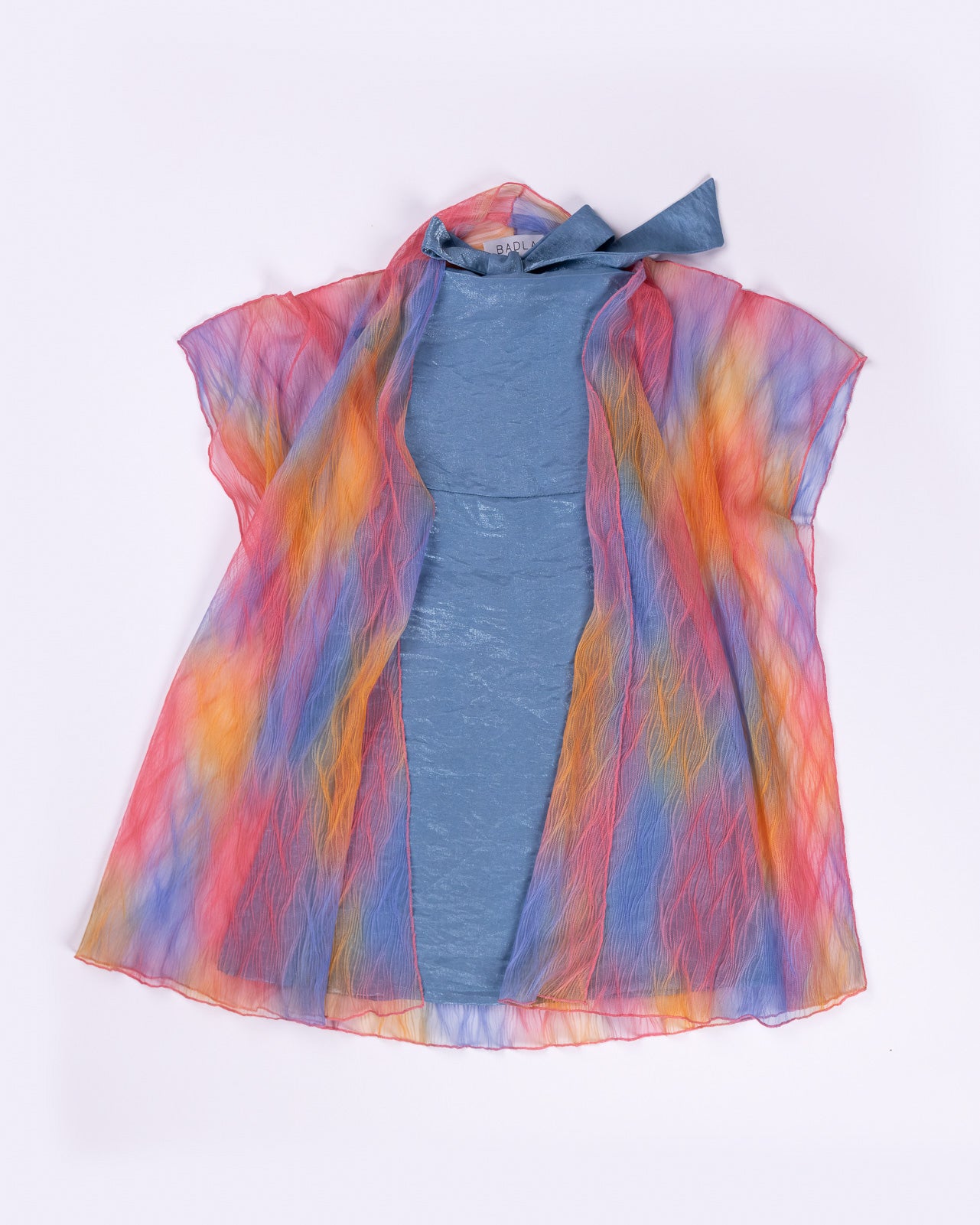 Set of two pieces of shiny dress and pleated colorful tulle Bisht.
