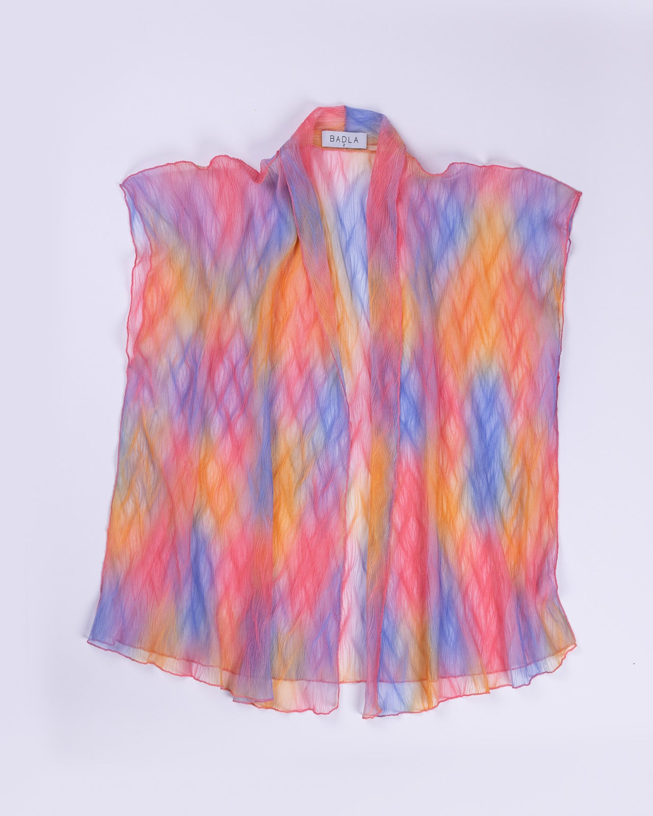 Maxi length colorful pleated tulle Bisht, wide cut, relaxed fit.