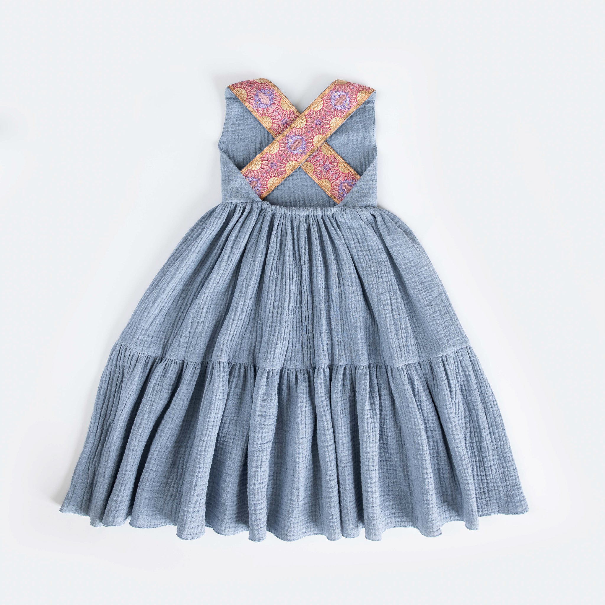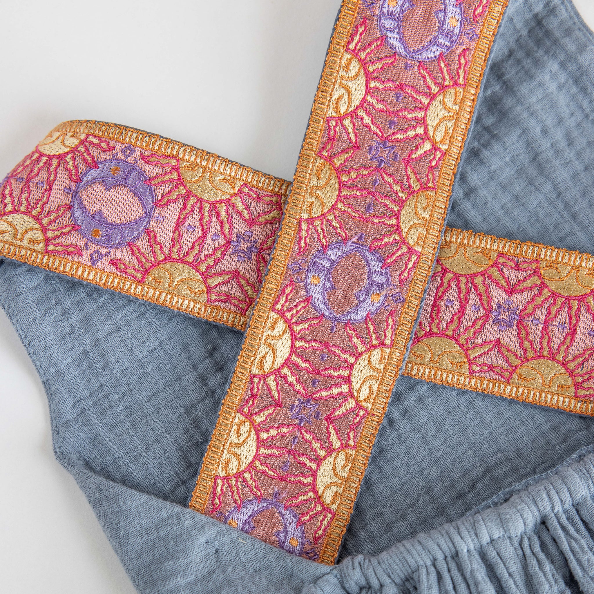 Cross back straps with embroidery.